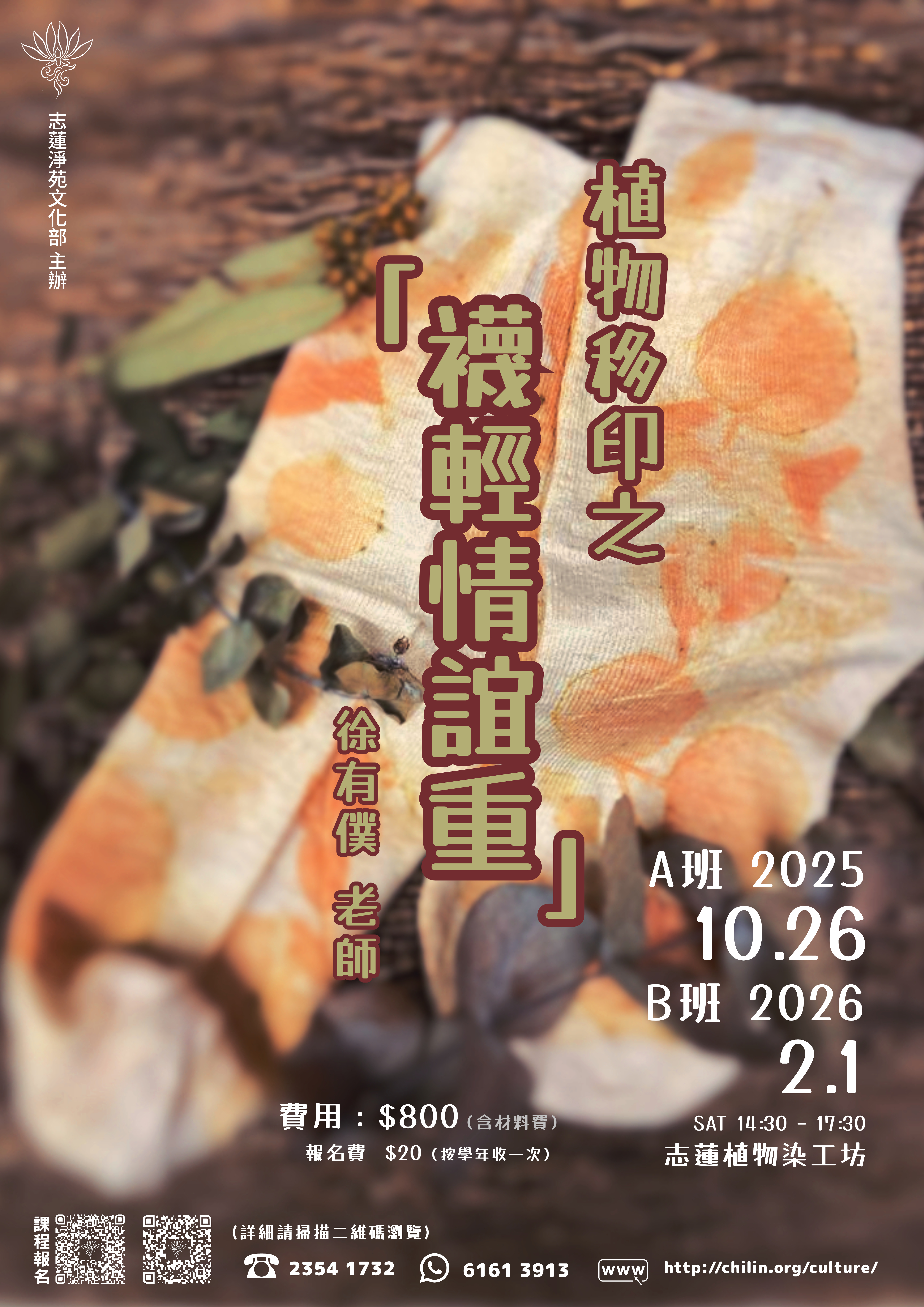 是次「植物移印染色工藝」正是將眼前當季植物的優美形態,移印在織物上,令學員在移印過程中,體味到「襪輕情誼重」的關愛精神。