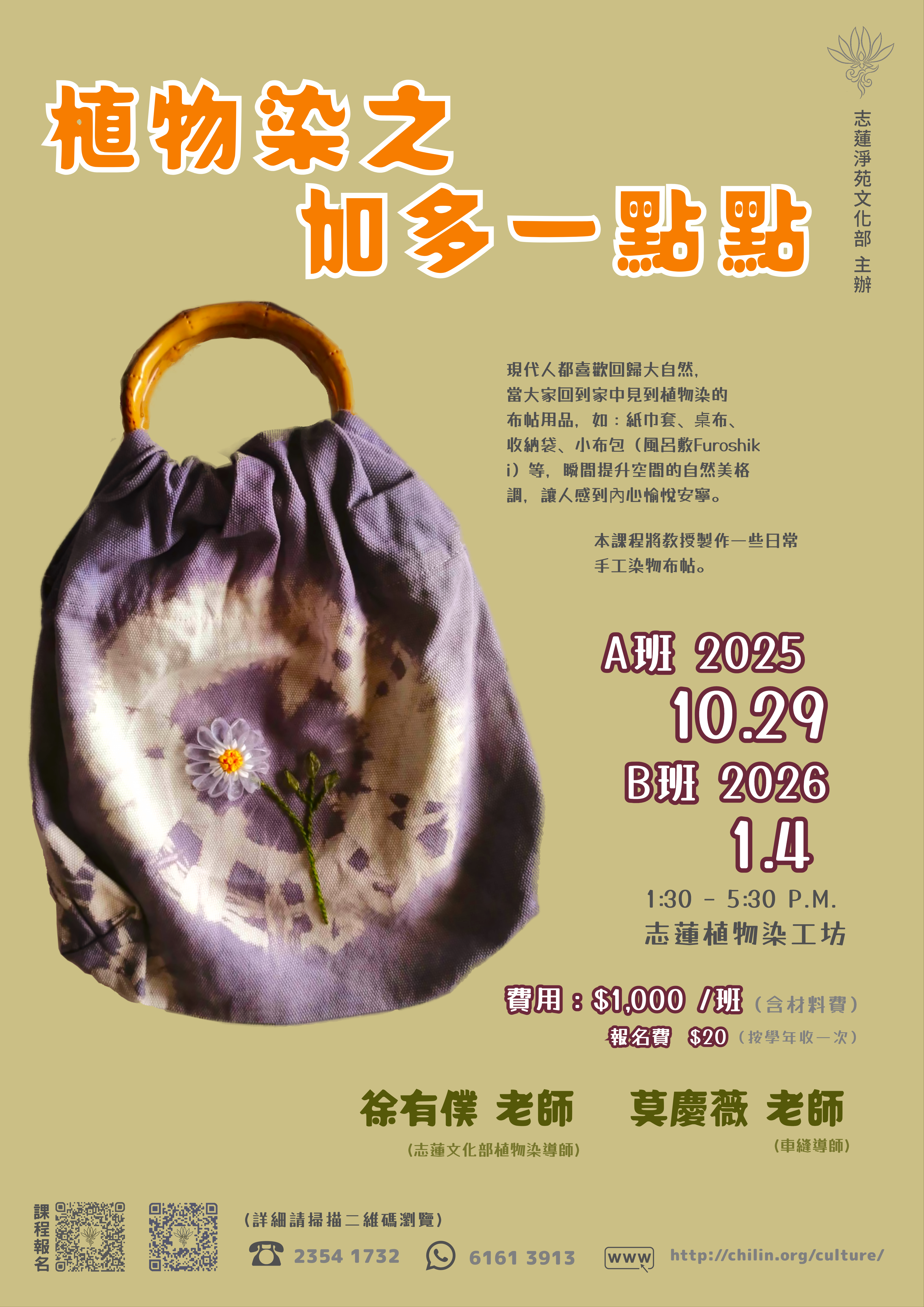 植物染工藝變化萬千,在天然染物上我們可以加上各種布藝裝飾、圖案花式等,令其內容更添姿彩。本課將按學員需要,在染物上加多一點點,令到生活增加多點色彩。