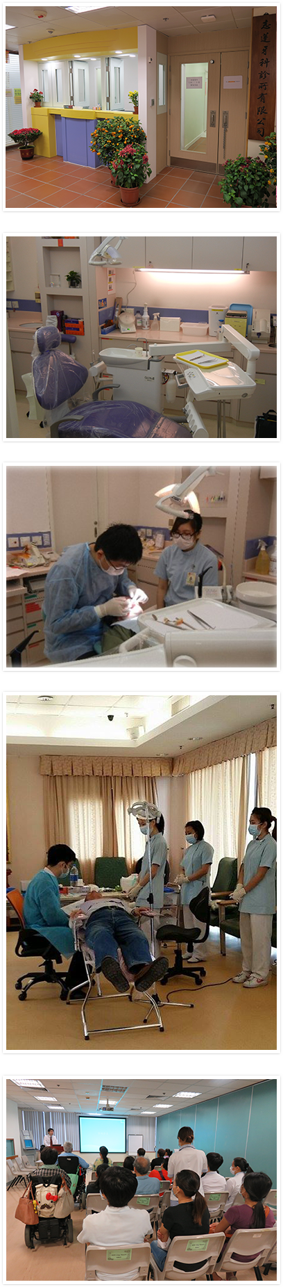 牙科诊所积极关注长者的牙齿健康及口腔卫生,并采用“社区为本”的服务模式,曾为超过贰仟位长者提供免费检查,简单脱牙,补牙及洗牙等治疗。同时,牙科诊所医生亦外展到社区中心主讲口腔卫生讲座及牙齿护理等,目的在加强社区长者对牙齿护理及口腔卫生等知识的预防工作。